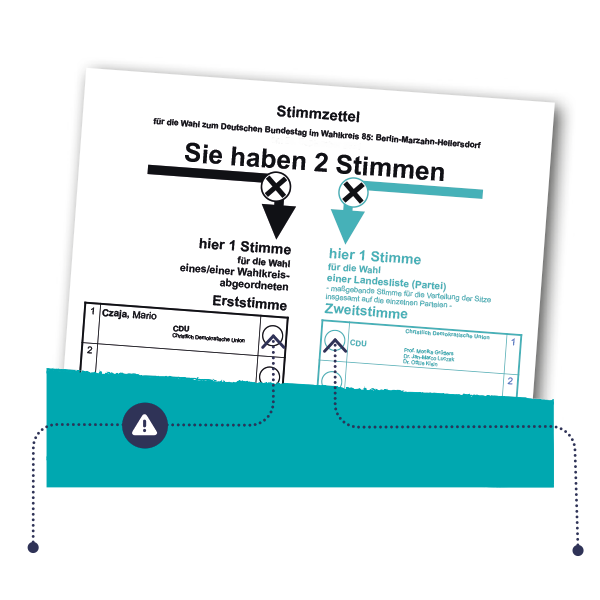 Mit Ihrer Zweitstimme wählen Sie die jeweilige Liste einer Partei. Diese Stimme entscheidet, wieviel Prozent jede Partei bekommt und ist damit unabhängig von der Erststimme.